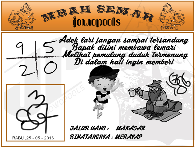 Demikian analisa prediksi togel dari Mbah Semar Hari ini Rabu 25 Mei 2016. Tetap utamakan prediksi anda sendiri.