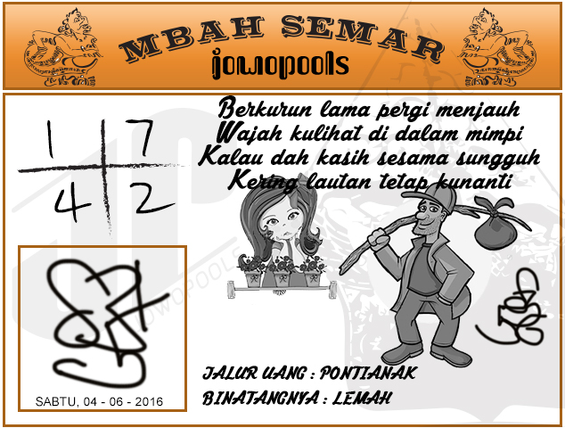 Demikian analisa prediksi togel dari Mbah Semar Hari ini Sabtu 04 Juni 2016. Tetap utamakan prediksi anda sendiri.