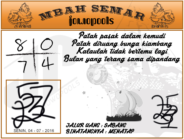 Demikian analisa prediksi togel dari Mbah Semar Hari ini Senin 04 Juli 2016. Tetap utamakan prediksi anda sendiri.