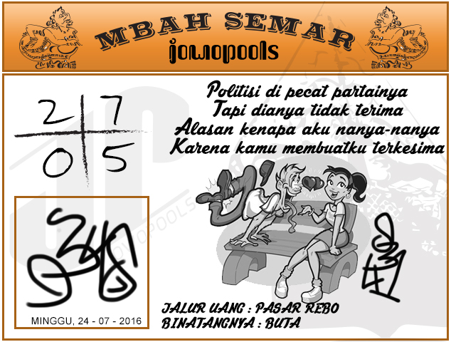 Demikian analisa prediksi togel dari Mbah Semar Hari ini Minggu 24 Juli 2016. Tetap utamakan prediksi anda sendiri.