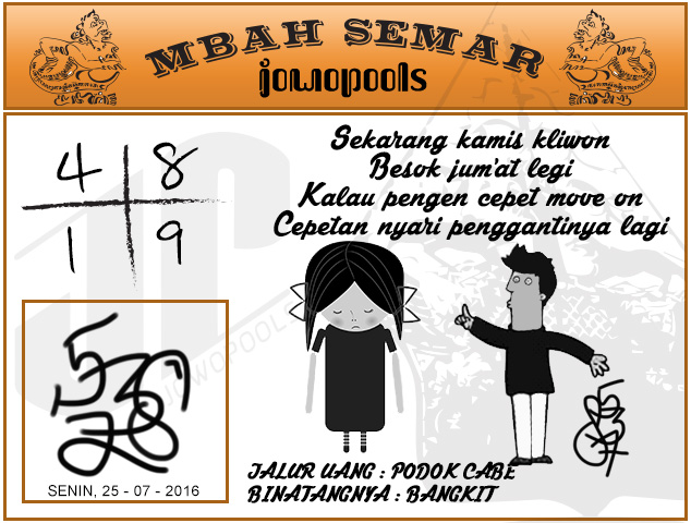 Demikian analisa prediksi togel dari Mbah Semar Hari ini Senin 25 Juli 2016. Tetap utamakan prediksi anda sendiri.
