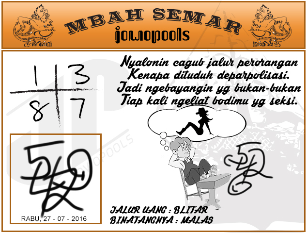 Demikian analisa prediksi togel dari Mbah Semar Hari ini Rabu 27 Juli 2016. Tetap utamakan prediksi anda sendiri.