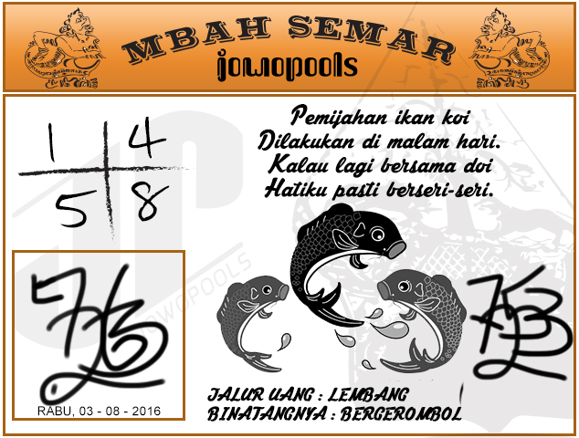 Demikian analisa prediksi togel dari Mbah Semar Hari ini Rabu 03 Agustus 2016. Tetap utamakan prediksi anda sendiri.