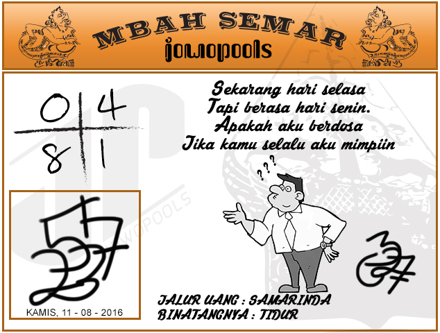 Demikian analisa prediksi togel dari Mbah Semar Hari ini Kamis 11 Agustus 2016. Tetap utamakan prediksi anda sendiri.