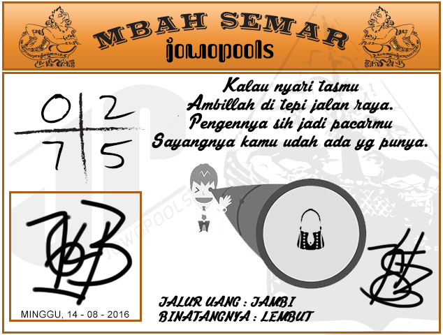 Demikian analisa prediksi togel dari Mbah Semar Hari ini Minggu 14 Agustus 2016. Tetap utamakan prediksi anda sendiri.