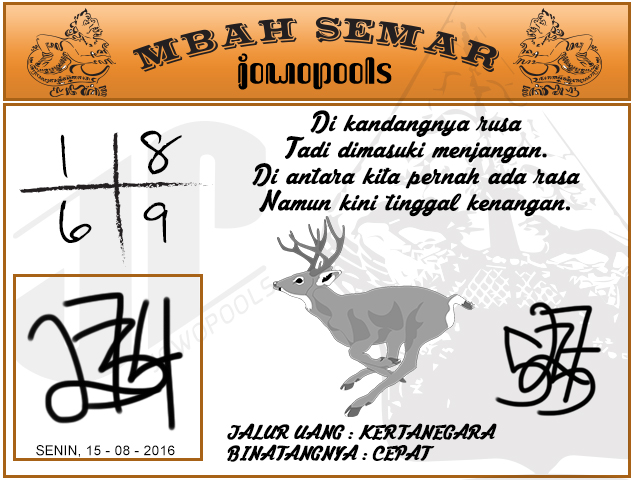 Demikian analisa prediksi togel dari Mbah Semar Hari ini Senin 15 Agustus 2016. Tetap utamakan prediksi anda sendiri.