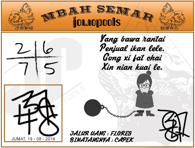 Demikian analisa prediksi togel dari Mbah Semar Hari ini Jumat 19 Agustus 2016. Tetap utamakan prediksi anda sendiri.