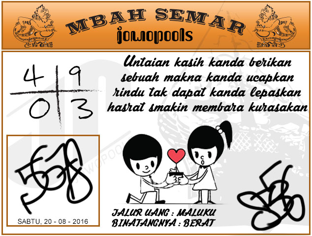 Demikian analisa prediksi togel dari Mbah Semar Hari ini Sabtu 20  Agustus 2016. Tetap utamakan prediksi anda sendiri.