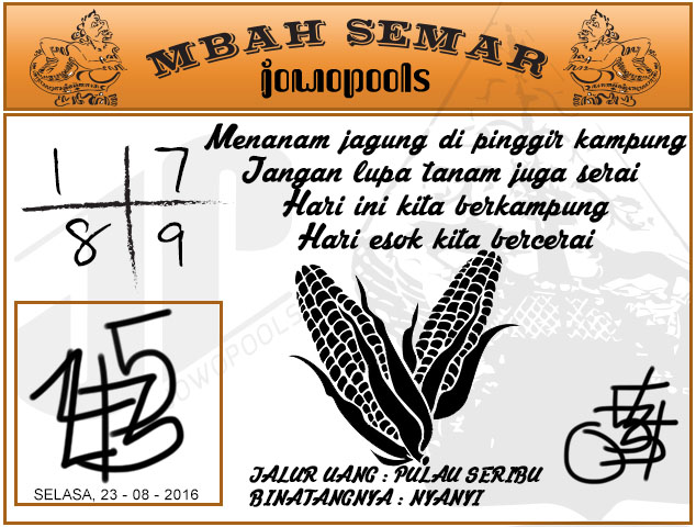 Demikian analisa prediksi togel dari Mbah Semar Hari ini Selasa 23 Agustus 2016. Tetap utamakan prediksi anda sendiri.